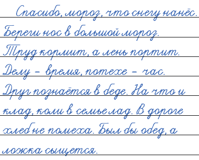 1. Спасибо, моро.., что снегу нанё.. . 2. Береги но.. в большой моро.. . 3. Тру.. кормит, а лень порти.. . 4. Делу – время, потехе – ча.. . 5. Дру.. познаётся в беде. 6. На что и кла.., коли в семье ла.. . 7. В дороге хле.. не помеха. 8. Был бы обе.., а ложка сыщется.