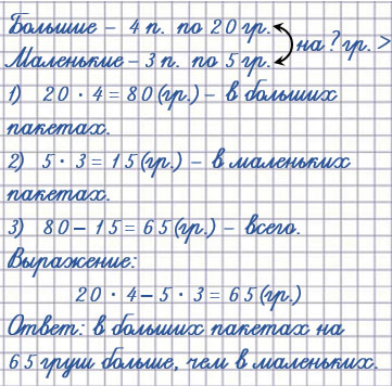 3. В четырёх больших пакетах лежат груши, по 20 в каждом, а в трёх маленьких пакетах - по 5 груш в каждом. Сколько всего груш ... ?