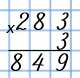 Умножаю десятки: 8 • 3 = 24, 24 дес. - это 2 сот. 4 дес.; 4 дес. пишу под десятками, а 2 сот. запоминаю и прибавляю их к сотням после умножения сотен.