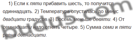 1) Если к (пять, пяти) прибавить шесть, то получится одиннадцать. 2) Температура опустилась до минус (двадцать, двадцати) градусов. 3) Восемь меньше (девять, девяти). 4) От (семнадцать, семнадцати) надо отнять четыре. 5) Сумма (семь, семи) и (пять, пяти) равна (двенадцать, двенадцати).