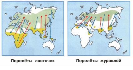 2. На этих схемах зелёным цветом показаны районы, где ласточки и журавли проводят лето. Жёлтым цветом показаны районы, где они зимуют. Обозначьте синими стрелками направление осенних перелётов ласточек и журавлей. Красными стрелками обозначьте направление из весенних перелётов.