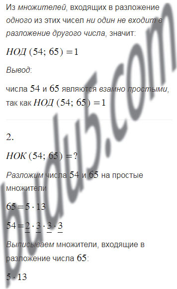 Являются ли числа 54 и 65 взаимно простыми? Найдите наименьшее общее кратное чисел 54 и 65. Равно ли оно произведению 54 и 65? Запишите какие-нибудь два взаимно простых числа. Найдите наименьшее общее кратное этих чисел. Сделайте вывод.