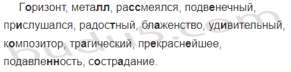 Г..ризонт, мета(л, лл), ра(с, сс)меялся, подв..нечный, пр..слушался, радос..ный, бл..женство, уд..вительный, к..мпозитор, тр..гический, пр..красн..йшее, подавле(н, нн)ость, с..стр..дание.