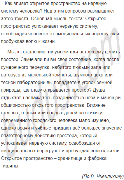Мы к сожалению (не)умеем (по)настоящему ценить простор. Зам..чали ли вы своё состояние когда после сум..речного переулка набитого людьми зала или автобуса из маленькой комнаты шумного цеха или тесной лаб..ратории вы попадаете в уголок земной пр..роды где глазу открывается простор? Душа отдыхает насл..ждаясь бездо(н, нн)остыо неба и манящей обширностью открытого пространства. Влияние степных горных или водных далей на психику совреме(н, нн)ого городского человека мало изуче(н, нн)о однако врачи и уч..(н, нн)ые пр..дают всё большее значение благотворному действию простора который успока..вает нервную систему освобождая от эмоциональных перегрузок и пробуждая волю к жизни. Открытое пространство хранилище и фабрика тиш..ны.4