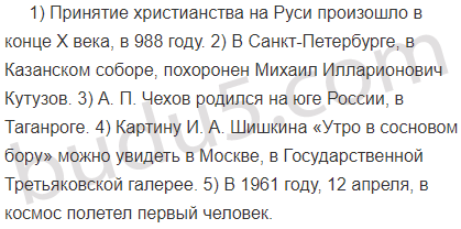 1) Принятие христианства на Руси произошло в конце X века. 2) В Санкт-Петербурге похоронен Михаил Илларионович Кутузов. 3) А. П. Чехов родился на юге России. 4) Картину И. А. Шишкина «Утро в сосновом бору» можно увидеть в Москве. 5) В 1961 году в космос полетел первый человек.