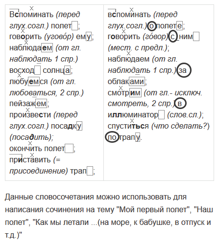 В..поминать полёт, в..поминать о полёт..; говорить ему, говорить (с)ним; наблюда..м восход солнца, наблюдаем за облаками; смотр..м в и(л, лл)юминатор, любу..мся пейзаж..м; произвести поса..ку, окончить полёт; приставить трап, спустит..ся по трапу.