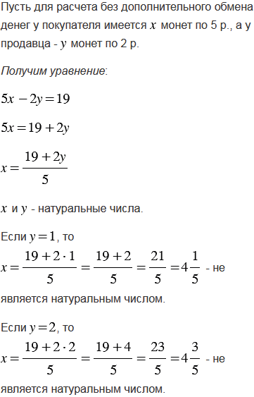 Тетрадь стоит 19 р. У покупателя имеются монеты только по 5 р., а у продавца - только по 2 р. Может ли покупатель рассчитаться за тетрадь без дополнительного размена денег? В случае утвердительного ответа, определите, какое наименьшее количество монет соответствующего достоинства должны иметь покупатель и продавец.