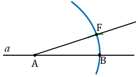 ставим точку А, с помощью циркуля измеряем отрезок ОЕ и строим окружность с центром в точке А радиуса ОЕ (всю окружность строить не обязательно, смотри, выделенное синим цветом). Точку пересечения окружности с прямой