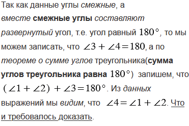 Какой угол называется внешним углом треугольника? Докажите, что внешний угол треугольника равен сумме двух углов треугольника, не смежных с ним.
