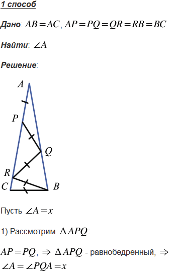 На рисунке 152 AB = AC, AP = PQ = QR = RB = BC. Найдите угол A.