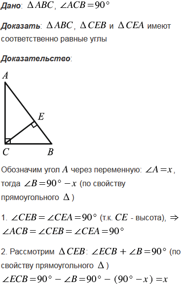 В прямоугольном треугольнике проведена высота из вершины прямого угла. Докажите, что данный треугольник и два образовавшихся треугольника имеют соответственно равные углы.