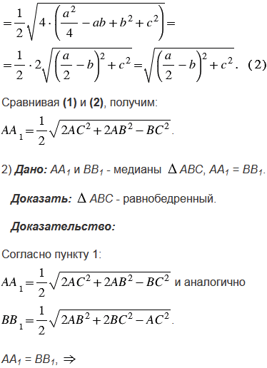 . Используя эту формулу, докажите, что если две медианы треугольника равны, то треугольник равнобедренный.